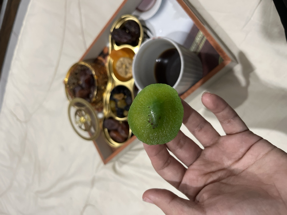 The image depicts a close-up scene occurring in Nuseirat, Palestinian Territory. In the foreground, a human hand, specifically the left hand, holds a single, vibrant green, conical-shaped object with a textured, granular surface and a dark speck at its apex. Below the hand and slightly to the right, a rectangular serving tray with a reddish-brown rim and a patterned base rests on a light beige, wrinkled fabric surface, consistent with a bedsheet. On the tray, a collection of items is arranged. A decorative, golden-colored round container with an open lid, exposing dark dried fruits (likely dates), is positioned at the back. In front of this, a horizontal golden dish with four compartments holds various dried fruits and nuts: the leftmost compartment contains dark dried fruits, the second holds small dark and light mixed dried fruits or nuts, the third contains a piece of light orange dried fruit, and the rightmost compartment holds more dark dried fruits. Adjacent to this dish, a white, ribbed ceramic cup filled with a dark brown liquid (consistent with coffee or tea) is visible. A small, circular, light purple object is partially visible behind the cup. No other individuals or significant actions are depicted.