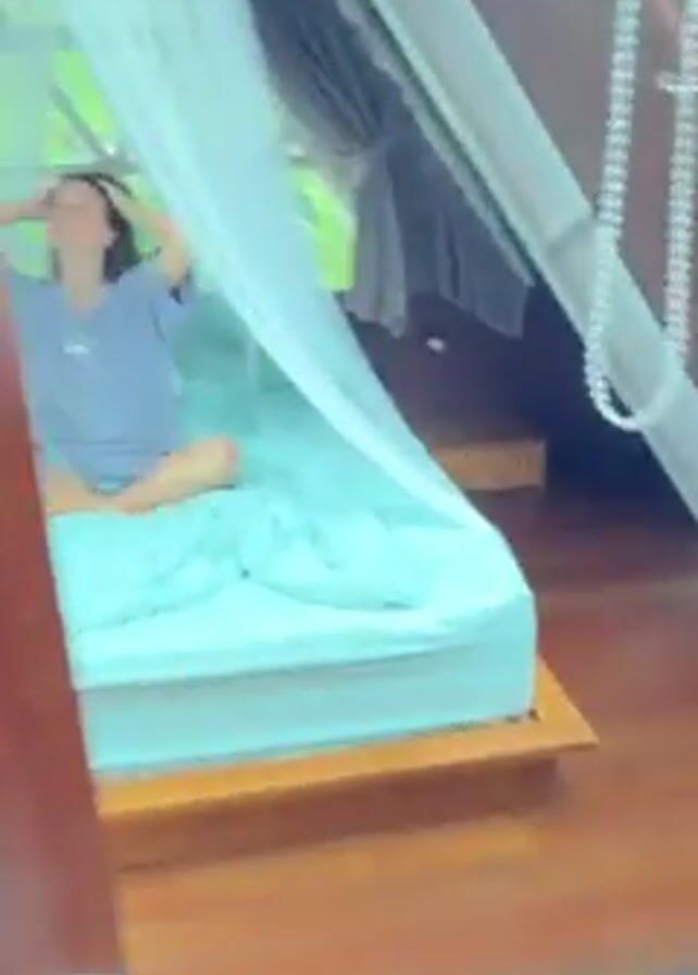 A person opens a brown door to reveal a woman sitting cross-legged on a bed. The bed is covered with light green linens and draped with white mosquito netting under the roof of an A-frame structure. The woman straightens her hair, picks up a white pillow, and throws it toward the camera while laughing.
