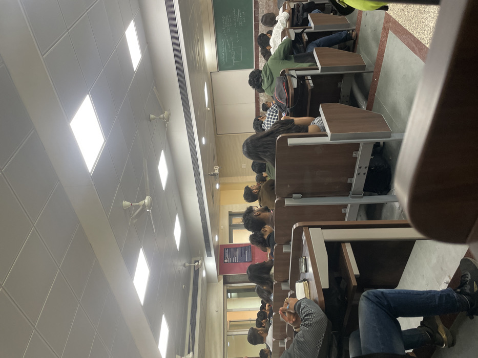 classroom setting in Jaipur, India (26.863, 75.815). The classroom is filled with students sitting at rows of desks. The desks are made of wood and have metal frames. The students are seated in rows, facing a whiteboard that is located at the front of the room. The whiteboard is partially visible in the image and appears to have equations written on it. There are ceiling lights and ceiling fans, which are turned on. The classroom appears to be located in a building with a tiled floor. The ceiling appears to be made of white tiles with gray grout. The image is taken from the perspective of a student seated at the back of the classroom looking toward the front of the room. A portion of another student's legs are visible in the foreground. The student is seated in a desk at the back of the classroom, looking toward the middle of the room. The student is wearing blue jeans and black shoes. The student's back is to the camera. The student appears to be focused on the lecture or on taking notes. The student is not interacting with other students. The student's desk is situated at the back of the classroom. The student is seated on a chair with a wooden back and metal frame. The desk is made of wood and has a metal frame. The desk appears to be empty except for a pen. The classroom is well-lit. There appears to be a large window in the background with a view of a hallway outside the classroom. The window is partially visible in the image. There are two ceiling fans in the image, both of which are turned on. The floor is tiled with a light gray-brown tile.