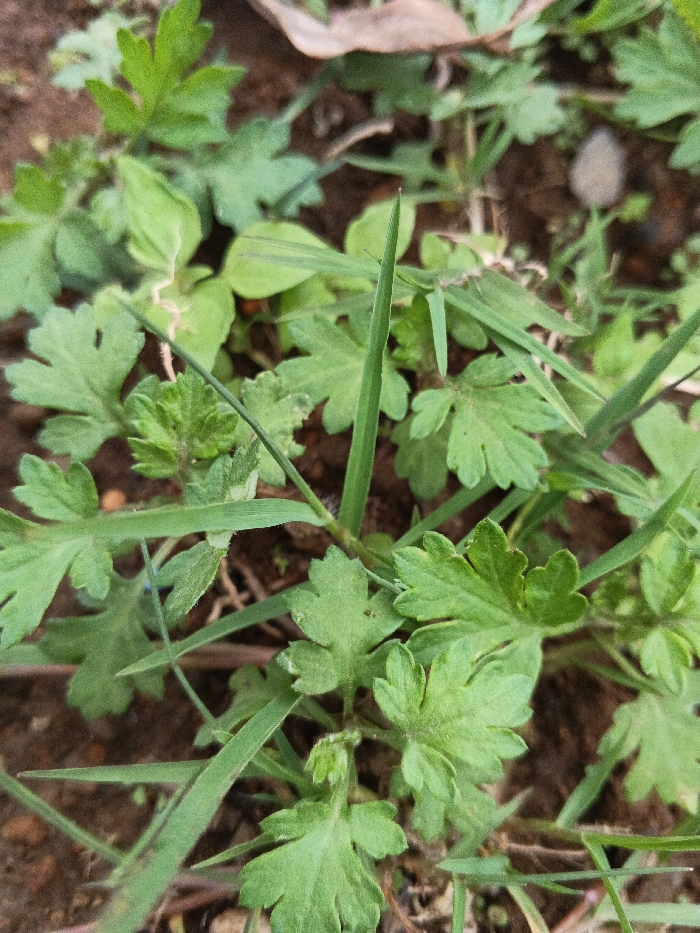 This image presents a close-up, ground-level view of various green herbaceous plants and grasses growing in dark brown soil in Pinnwe, Myanmar (Burma). The primary subjects are numerous clusters of plants featuring deeply lobed or compound green leaves. Interspersed among these are several thin, upright blades of green grass. The soil, visible between the plants, appears moist and rich. No human subjects, animals, or man-made objects are present. The scene depicts natural ground vegetation under diffuse lighting conditions.