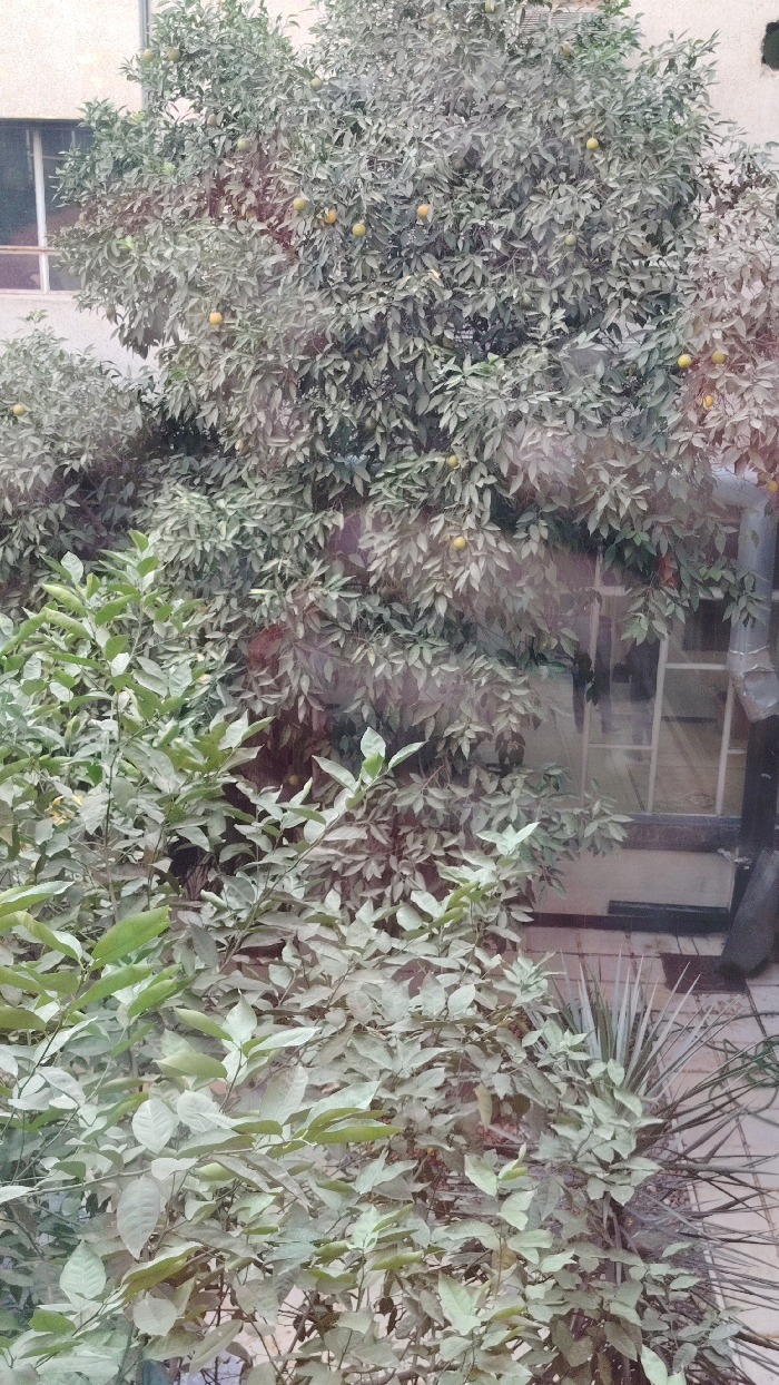 A dense green tree, dotted with yellow fruits, dominates the scene. Its branches reach towards a building with a window. In the foreground, lush greenery of varying shades partially obscures a view of tiled ground with more sparse vegetation to the right. A drainpipe and a ladder are visible through the dense foliage. The scene appears somewhat hazy.