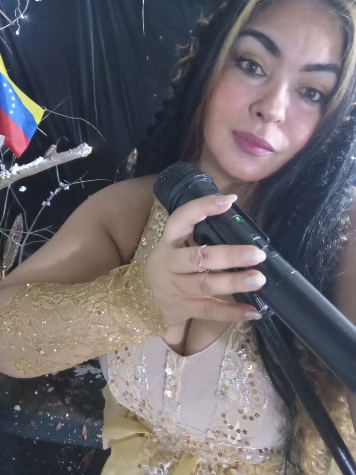 The scene is situated in the city of Juan Griego, Venezuela. A female individual is depicted in a close-up, chest-up view, looking directly forward. She has long, dark, wavy hair with prominent blonde streaks. Her face exhibits visible makeup, including gold eyeshadow and pink lipstick. She holds a black handheld microphone with a visible green indicator light in her right hand. Her right hand displays light-colored, manicured fingernails and a simple band ring on her ring finger. She wears a light-colored, possibly beige or cream, garment adorned with gold sequins and lace. A sheer, glitter-covered gold lace sleeve is visible on her left arm, extending past the elbow. The immediate background is dark. To the upper left, a small Venezuelan flag is displayed, showing its yellow, blue, and red horizontal stripes with an arc of white stars on the blue band. Adjacent to the flag are decorative, thin, branched elements appearing covered in glitter or small lights.