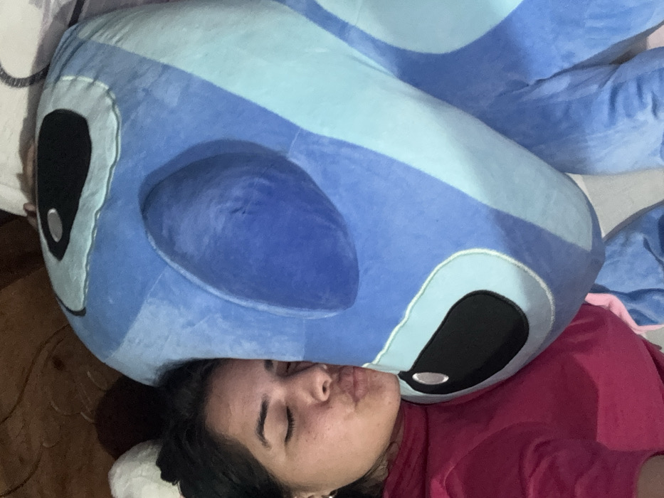 An individual, identified as an adult female, is depicted in an indoor setting in Altagracia, Venezuela. She has dark hair, closed eyes, and her lips are pursed, suggesting a kissing gesture. She wears a pink top and an earring is visible on her left ear. Her head rests against a dark wooden headboard on the left side of the frame. Positioned next to her, and making direct contact with her pursed lips, is a large blue plush toy resembling the character Stitch. The plush toy features prominent black and white eyes, a dark blue nose area, and lighter blue details on its body. A white, patterned pillow is partially visible behind the plush toy on the right.