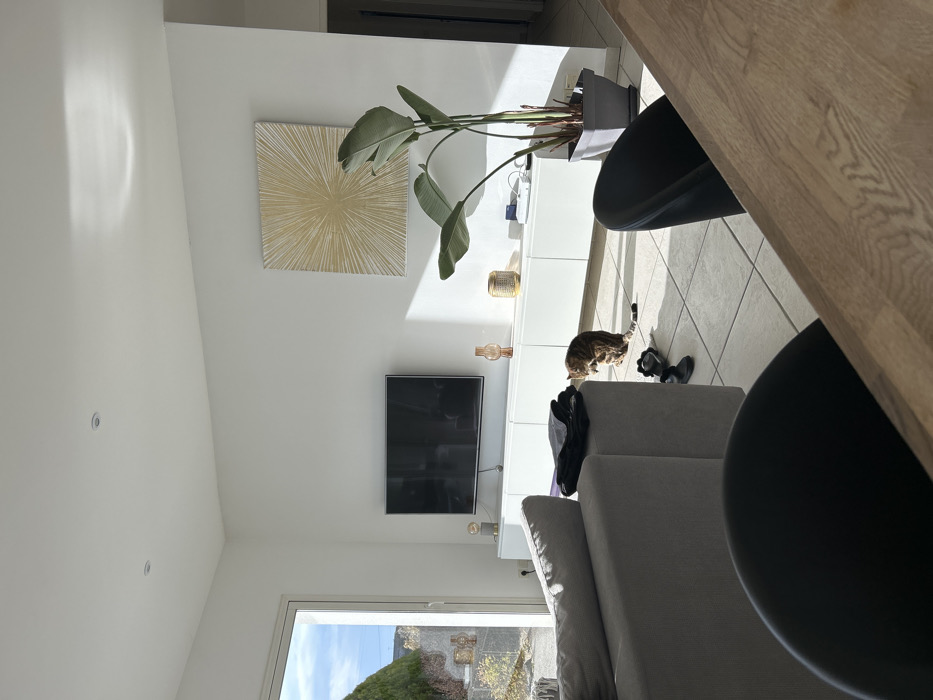 This image captures a brightly lit interior scene, identified as a residential living space in Veauchette, France. The room features white walls, a white ceiling with recessed lighting, and a light-colored tiled floor. Strong natural sunlight enters from a large glass sliding door on the left, casting distinct shadows across the floor and illuminating various objects. On the left, a portion of a light grey sectional sofa is visible, with dark fabric folded on its surface. Two black sandals lie on the floor beside the sofa. A wooden dining table and a black dining chair are partially visible in the immediate foreground, suggesting an open-plan layout. Centrally positioned against the main wall is a large black flat-screen television mounted above a long, white, low-profile media console. The console holds a metallic decorative object on the left, an amber-colored vase, and a gold-colored cylindrical object on the right. To the right of the console, a white electronic device with visible cabling sits on the floor. A large, leafy houseplant in a dark grey square pot stands on the floor to the right of the console. Above the plant, a square piece of wall art with a radiating golden design is affixed to the wall. A brown tabby cat is located on the sunlit tiled floor in front of the media console, appearing to groom itself with a front paw raised. A thin, dark object is near the cat's tail. Through the glass door on the left, an outdoor area is visible, featuring green foliage, possibly a manicured hedge, and a bright sky with some clouds. In the far background on the right, a doorway or hallway entrance is discernible. No human figures are present.