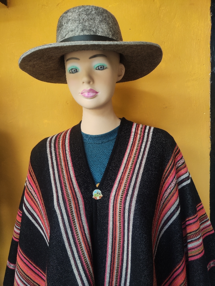 A display mannequin, appearing to be female, is positioned against a solid yellow wall in Wanchaq, Peru. The mannequin wears a light gray, wide-brimmed felt hat with a black band. Its head is bald, with painted facial features including light blue eyeshadow and pink lips. Below the hat, a dark teal, long-sleeved crew-neck shirt is visible. Over the shirt, the mannequin wears a black poncho featuring prominent vertical stripes in varying widths, colored predominantly in shades of pink, red, orange, and white, with thin brown accents. A small, circular, multicolored pin depicting a landscape or an animal is fastened to the front center of the poncho. A dark, possibly black, vertical strip is present along the right edge of the frame, indicating a structural element like a doorframe or corner.