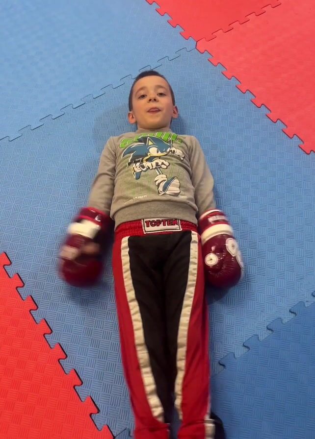 A young boy, likely between 5 and 7 years old, lies on a blue and red interlocking foam mat. He is wearing a gray long-sleeved shirt with a Sonic the Hedgehog graphic, red and black kickboxing pants with white stripes, and red and white hand wraps. He is lying on his back with his arms extended to the sides and legs spread, forming a star shape. The camera zooms in closer to his face as he looks directly at the camera and speaks. The background consists solely of the blue and red floor mats.