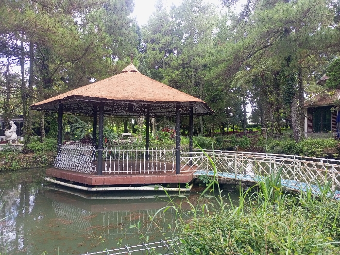 An outdoor scene in Cipanas, Indonesia, displays a predominantly green, wooded environment with a gazebo and pond as central features