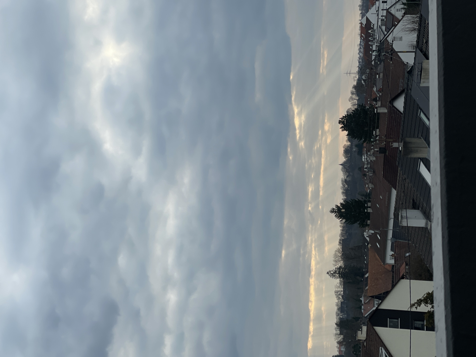An elevated view captures a residential area in Senden, Germany, under a heavily overcast sky