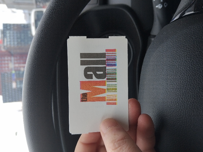 A left hand holds a white rectangular card in the foreground, positioned in front of a black, textured steering wheel within a vehicle. The card displays "the Mall" in stylized font, with "the" in small red characters and "Mall" in larger orange and dark gray letters. Below the text, a horizontal strip features numerous short, vertically oriented, multi-colored lines. The vehicle's dashboard and a control stalk are partially visible behind the steering wheel. Through the windshield, an urban environment is visible under an overcast sky. Multiple multi-story buildings with reddish-brown facades and numerous windows are present in the background. A red sign is discernible on the roof of one building. A white bus or large vehicle is partially visible on the far right. The scene is located in Sofia, Bulgaria, specifically in the vicinity of "The Mall" shopping center on Tsarigradsko shose Boulevard, identifiable by the card's text and the background urban architecture.