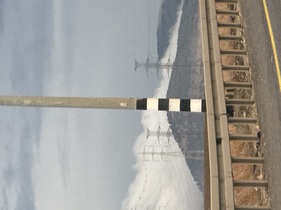 The image displays an outdoor landscape viewed from a roadway, situated in or immediately adjacent to Afula, Israel, overlooking terrain consistent with the Jezreel Valley region. In the foreground, a metallic guardrail, light grey with a dark brown top section, extends horizontally across the lower third of the frame. Below the guardrail, a segment of dark asphalt road is visible, marked with a single yellow line. Behind the guardrail, dry, light brown vegetation and scattered debris are present. A tall, light-colored utility pole, marked with alternating black and white horizontal stripes on its lower section, stands prominently in the right-center, extending vertically from just above the guardrail almost to the top of the image. The midground features a series of undulating hills, covered in sparse, dark green and brown vegetation, stretching across the scene. Several large metal lattice electricity transmission towers are erected on and behind these hills, with visible power lines connecting some of them. Patches of white, low-lying cloud or mist partially obscure portions of the hills and some of the towers. The background consists of an overcast sky filled with various shades of grey clouds. No people or animals are present.