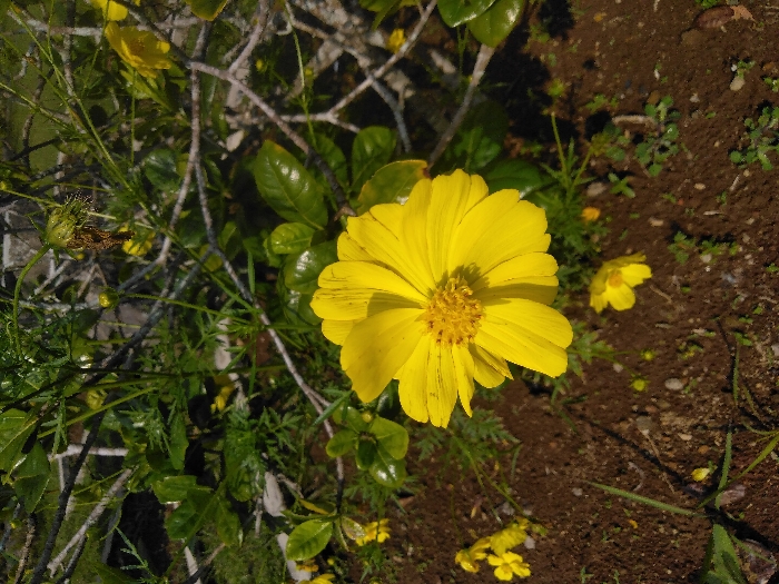 A close-up photograph taken in Eghezée, Belgium, displays a single yellow flower as the central subject. This flower features numerous bright yellow ray florets radiating from a textured, yellow-orange disc floret center. Surrounding the prominent flower is a dense array of green foliage, including plants with small, glossy oval leaves and others with delicate, dissected leaves and stems. Interspersed within the background greenery are several thin, dry, greyish-brown branches. Smaller yellow flowers, some fully bloomed and others as developing buds, are visible in various stages of growth throughout the mid-ground. The foreground consists of dark brown soil, which contains small stones and sparse green plant sprouts. The scene is brightly illuminated by natural sunlight, producing distinct highlights on the vegetation. No individuals, animals, or active interactions are present in the image.