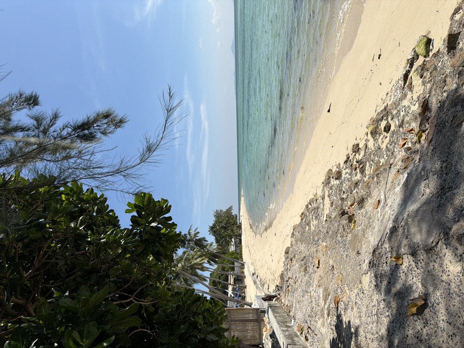A beach scene with turquoise water meeting a sandy shore. Trees and greenery line the left side, contrasting with a concrete or stone wall on the right, marked with leaves and shadows. Palm trees and buildings are visible in the distance along the shoreline. The sky is blue with scattered clouds.