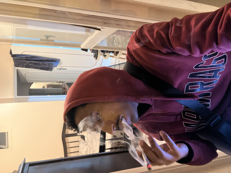 A male individual, appearing to be in his 20s or 30s, is shown indoors in a medium shot. He has dark curly hair, a mustache, and a short beard, and is wearing a red hooded sweatshirt with the hood up, featuring white and black text, and a black shoulder bag strap across his chest. He holds a lit cigarette or joint between his left index and middle fingers, from which smoke trails. He is actively exhaling a large cloud of smoke from his mouth, partially obscuring his face. The background on the left includes a dark wooden bed frame with a white patterned duvet and a dark wooden dresser. To the right, an open doorway leads into a light-colored hallway, where a white door with a dark blue garment draped over it is visible, alongside a multi-tiered circular stand. The walls are light beige. The scene is set indoors in what is indicated as Tanger, Morocco.