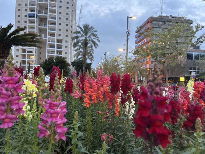 The image depicts an urban landscape in Holon, Israel, during what appears to be dusk or dawn, under an overcast, light blue-grey sky. In the foreground, an extensive flowerbed of Antirrhinum majus (snapdragons) is present, featuring blooms in shades of fuchsia, pink, red, dark red, orange, yellow, and white. Directly behind the flowerbed, a paved area or street is visible, with illuminated streetlights, one of which displays an Israeli flag. Various trees, including palm trees and deciduous species, are interspersed throughout the midground. In the background to the left, a tall, multi-story residential building with numerous balconies is visible, with several interior lights illuminated. A large construction crane is partially discernible behind this building. To the right, another multi-story, concrete-faced building features prominent vertical orange and blue elements on its facade, possibly decorative lighting. A yellow commercial sign is visible at the ground level of this building. No individuals are distinctly visible in the scene.
