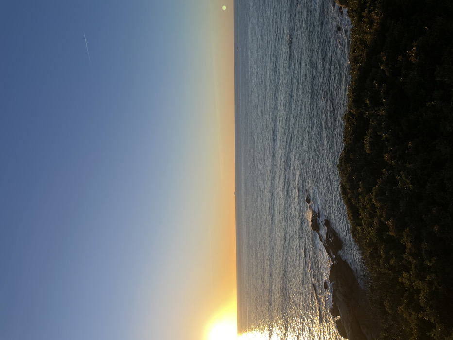The image depicts a coastline at sunset. The sky transitions from blue to orange near the horizon, where the sun's glow reflects off the water. Waves break gently on rocky shores, bordered by a dark, dense line of vegetation. A contrail is visible in the upper left corner of the sky.