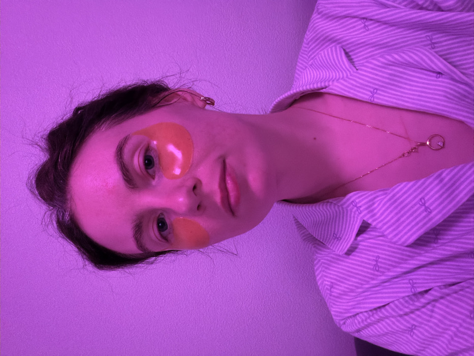 A female subject is depicted in a frontal portrait from the chest up, located indoors in Yanino-1, Russia, against a plain wall. The scene is illuminated by a prominent purple light source, casting a strong magenta hue across the subject's face, hair, and clothing. The subject has dark hair, fair skin (color-shifted by the purple light), and is looking directly forward. Two orange-colored gel patches are adhered beneath her eyes. She is wearing a gold-colored hoop earring in her visible right ear and a gold-colored necklace with a circular pendant containing a stylized geometric shape. Her attire consists of a light-colored, possibly white, striped button-up shirt or pajama top featuring narrow horizontal stripes and small, faint bow-tie patterns.