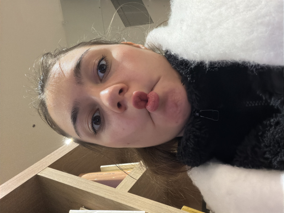 A woman poses with pursed lips, looking directly at the camera from a low angle. She's wearing a black jacket with white fur accents and visible zipper. A shelf is partially visible in the lower left corner, cluttered with books. The background is blurred, giving a sense of being indoors with bright, diffuse lighting.
