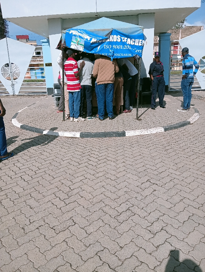 The image displays an outdoor scene in Mumbuni North ward, Kenya, under bright daylight with visible shadows. The ground is paved with a herringbone pattern of concrete pavers. A circular concrete island with black and white curbing is situated in the foreground. Centrally, a light blue canopy tent is erected, displaying text including "MACHAKOS TEACHER" and "ISO 9001:20...". Approximately 6-8 individuals, primarily men, are clustered closely around and within the tent's immediate vicinity, facing inwards, suggesting engagement with its contents or services. One man wears a red and white striped shirt and blue jeans, another a brown jacket and blue jeans. To the right of the tent, a female security officer in a dark blue uniform, including a cap and a badge, stands observing with her hands in her pockets. Adjacent to her, a man in a blue and white striped long-sleeve shirt, blue jeans, and a dark baseball cap also stands, observing the scene. In the background, a light blue and white building structure, possibly an entrance or gatehouse, is visible. To the left of this structure, a large white gate with a distinct circular design is partially visible. Additional buildings are present in the distance beyond the gate. The lower body of another individual is partially visible on the far left of the frame.