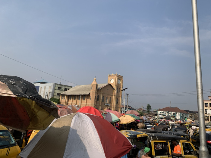 This image depicts a bustling street scene in Alagbede, Nigeria, under a hazy light blue sky