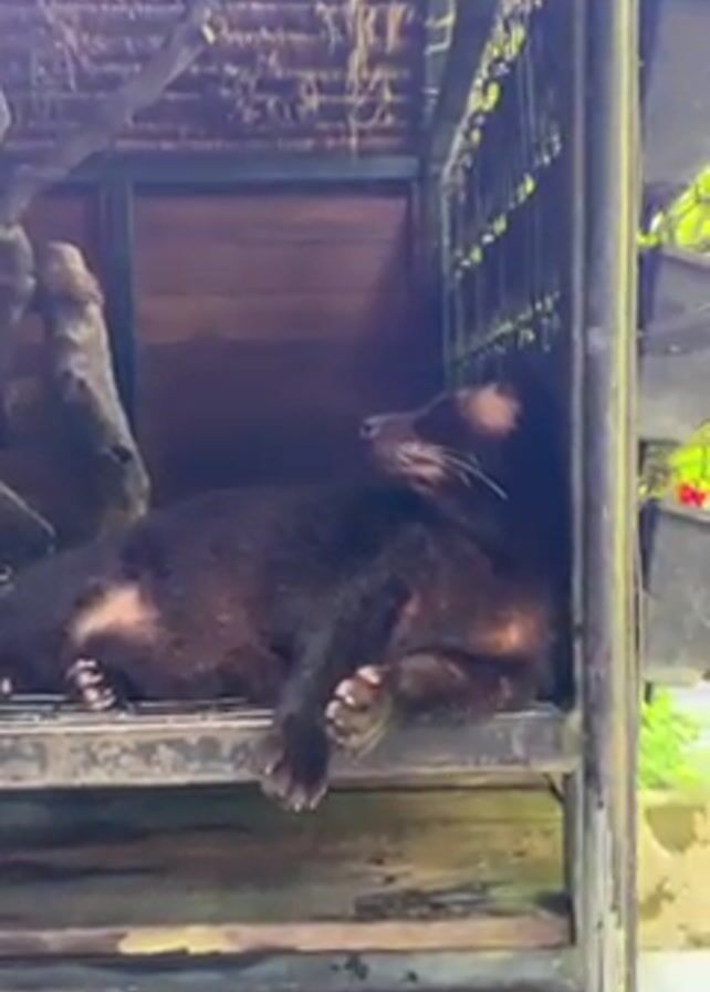 civet resting on a metal platform inside a cage