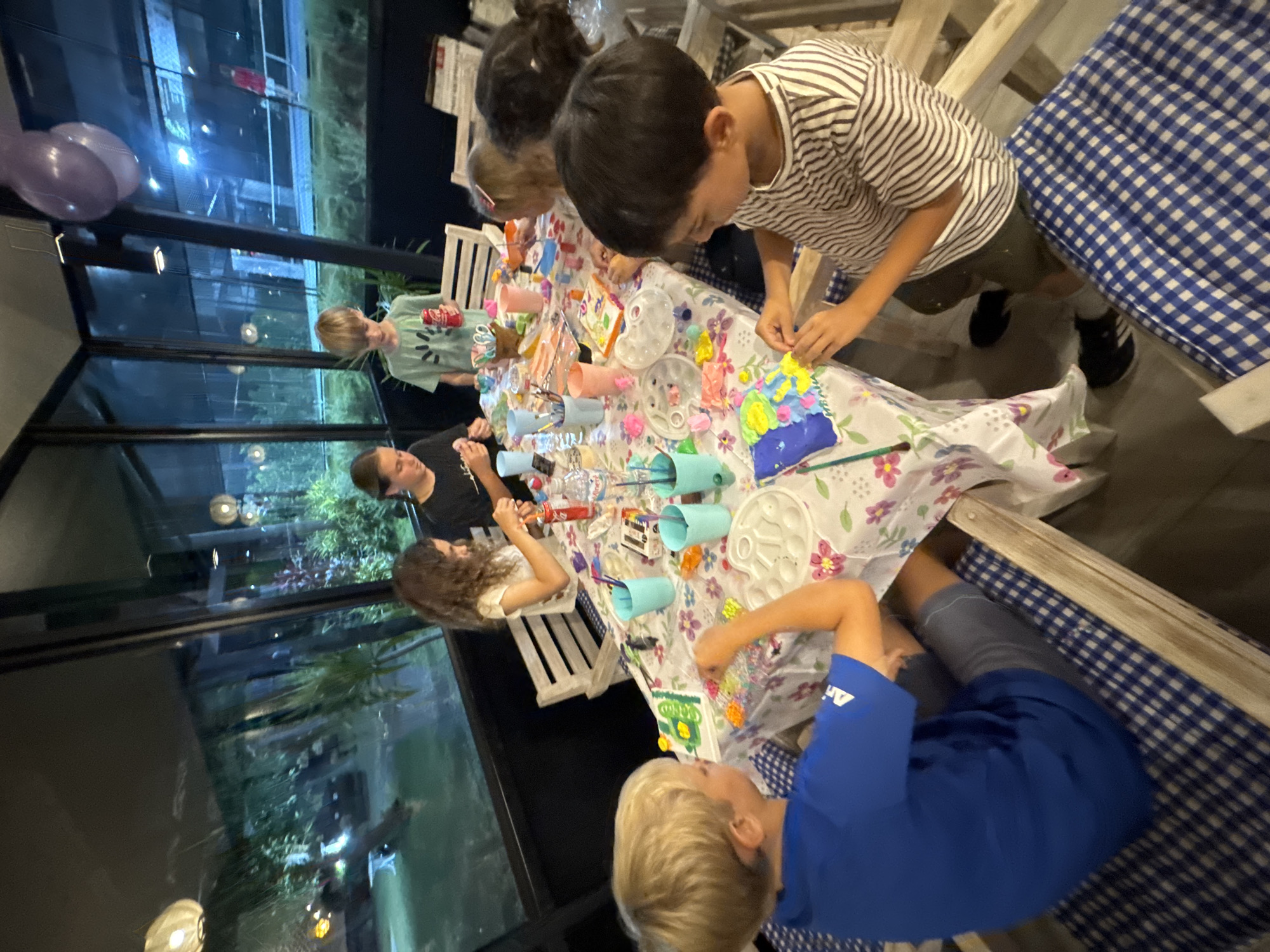 An indoor scene in Baan Plai Laem, Thailand, depicts seven children engaged in a crafting activity around a rectangular table. The specific establishment within Baan Plai Laem is not identifiable from the image. The table is covered with a white tablecloth adorned with a floral pattern of pink and purple flowers and green leaves. Numerous craft supplies are distributed across the table, including various colored modeling clay, paint palettes, paintbrushes housed in teal and pink plastic cups, small containers, scissors, and bottles of water. A red soda can is also present. Seven children, appearing to be between approximately 6 and 12 years of age, are seated on white wooden benches with blue and white checkered cushions. At the front-left, a blonde-haired boy in a blue short-sleeved shirt is focused on shaping craft materials. Opposite him, at the front-right, a dark-haired boy in a white and dark striped long-sleeved shirt is similarly engaged. Towards the back of the table, a girl with long, curly brown hair in a white top, a girl in a black shirt, and a blonde-haired boy in a light green shirt (holding the red soda can) are concentrated on their projects. Two additional younger children are partially visible on the far right, also participating. The room features large glass panel windows offering a view of an illuminated outdoor garden area at night. The exterior displays lush green foliage, trees, and artificial lighting, with what appears to be a pool or water feature in the background. Spherical pendant lights are visible both inside and outside the facility. Two purple balloons are affixed near the ceiling on the right side of the indoor space, suggesting a celebratory event.