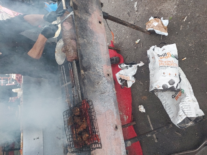 This image depicts an outdoor grilling operation in Eckbolsheim, France