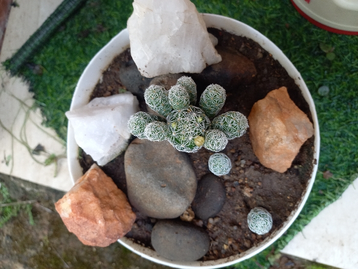 The image displays an overhead view of a planter located in Barakin Lerawi, Nigeria. A white, cylindrical planter contains dark brown soil. Centrally positioned within the soil is a cluster of multiple small, spherical, spiny green cacti, exhibiting several smaller offsets and two minute yellow structures. Arranged around the cacti are several natural stones: three angular, opaque white quartz fragments; two smooth, ovoid, dark grey river stones; two irregularly shaped, reddish-brown rocks; and one smaller, dark brown pebble. The planter is situated on a surface composed of green artificial turf, which extends across the right half and bottom of the frame, with a dark green coiled object partially visible on the turf in the upper right quadrant. To the left and top of the planter, a light-colored concrete or paved surface is visible, interspersed with sparse green weeds. A partial red and white circular object is discernible in the bottom right corner of the frame. No human figures or discernible actions are present within the scene.