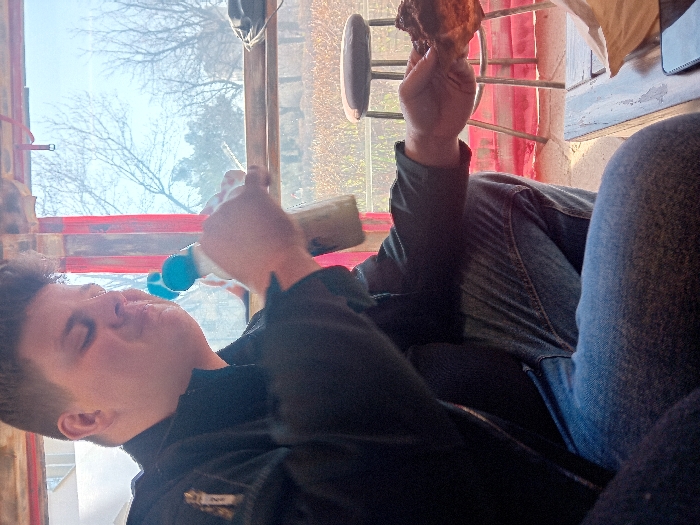 The image depicts a male individual within an outdoor or semi-enclosed dining area in the city of Sliven, Bulgaria. The subject, a young adult male with short dark hair, is positioned in a crouching or seated posture, oriented towards the left. He wears a dark zippered jacket over a dark shirt and blue jeans. His facial expression suggests active consumption, with eyes partially closed and cheeks slightly puffed. In his right hand, the man holds a light-colored bottle with a distinctive bright blue cap, positioned near his mouth. His left hand holds a piece of dark, irregularly shaped food, possibly a pastry or fried item. A wooden table is visible in the lower right foreground, bearing a crumpled light brown paper bag and a dark-colored smartphone. The environment behind the subject consists of a clear panel, likely plastic or glass, framed by red structural elements. Beyond this panel, an outdoor scene is visible under a bright sky. Deciduous trees with bare branches dominate the middle ground, alongside patches of dry, light-brown vegetation. A dark stool with a circular seat is positioned to the right of the subject through the panel. In the distant background, a light-colored building is partially visible. The overall scene suggests a casual dining experience in an outdoor setting during cooler weather, given the bare trees.