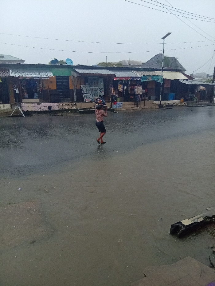The image depicts a street scene in Aba, Nigeria, under rainy conditions