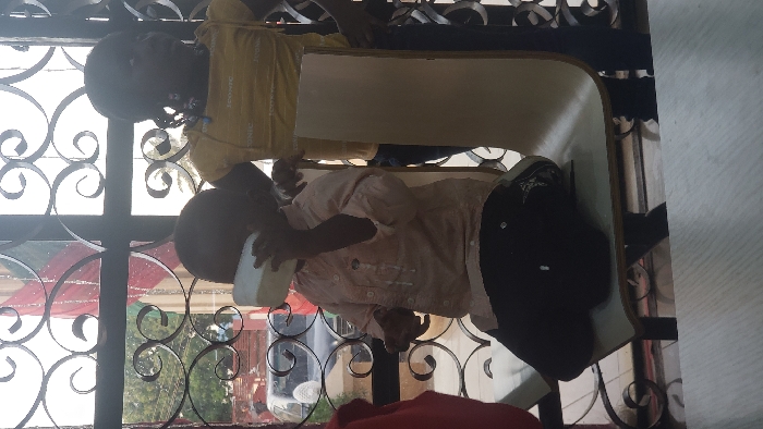 The image depicts an interior scene in Sabon Tasha, Nigeria, viewed outwards through a dark, decorative iron grille with scrollwork. In the foreground, two children are present. A young child, wearing a light peach long-sleeved button-up shirt, is seated on a light-colored chair. This child holds a white, rectangular, opaque container to their mouth, from which white liquid is actively dripping down the front of their shirt. A dark baseball cap rests on the chair seat next to this child. To the right, an older child, dressed in a yellow short-sleeved t-shirt with the word "ICONIC" printed on it, stands with hands placed on their hips, looking towards the right side of the frame. The exterior environment visible through the grille includes green foliage and trees, a dark-colored vehicle on the left, and a vertically hanging banner or flag displaying red, light, and green sections from top to bottom. A light-colored, wood-grain patterned surface, likely a tabletop, occupies the immediate bottom foreground.