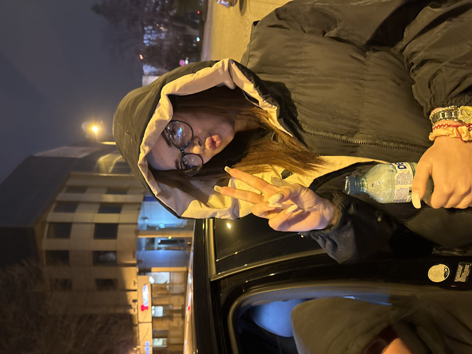 A nighttime scene unfolds on a street in Sliven, Bulgaria, identified as being at or near **bul. "Tsar Osvoboditel" 36**. The central figure is a young female with long brown hair, wearing black-rimmed eyeglasses and a black puffer jacket with a light-colored hood lining. She makes a "peace" sign with her right hand, exhibiting long, light-colored fingernails, and puckers her lips towards the camera. In her left hand, she holds a translucent plastic bottle with a blue cap, containing a liquid and bearing a label partially visible with the letters "DE". Her left wrist displays a gold-toned watch and multiple red fabric bracelets. She stands adjacent to the open rear passenger door of a dark-colored vehicle. Inside the vehicle, a partial view of another individual, obscured by a dark hooded garment, is discernible. The background features several multi-story buildings under artificial illumination. A prominent light-colored building with a rounded corner and numerous windows is visible. Further down the street, a red illuminated sign displaying white Cyrillic text, partially legible as "ТЕЛЕНОР" (Telenor), is mounted on a building. Another blue illuminated commercial sign is visible beyond. Bare tree branches are silhouetted against the dark sky, and streetlights illuminate the asphalt road and surrounding structures.