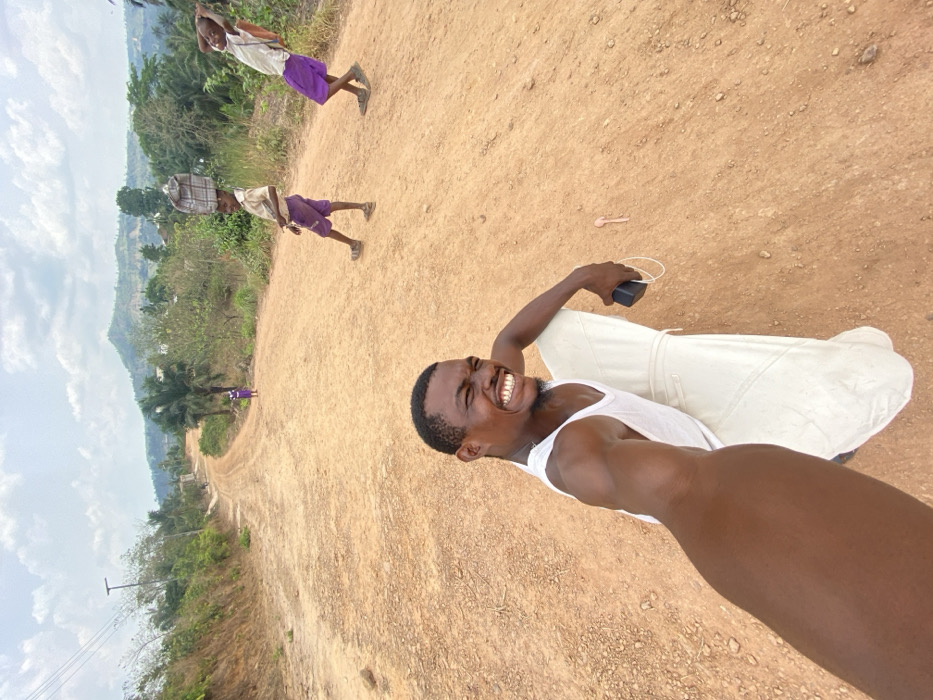The image depicts a daylight scene on an unpaved, reddish-brown dirt road in Nguzu Edda, Nigeria. In the immediate foreground, an adult male with dark skin, short dark hair, and stubble is seen taking a selfie. He is wearing a white sleeveless undershirt and light-colored trousers, crouching with his right arm extended, holding a black smartphone with white wired earbuds. His face displays a wide, toothy grin, and his eyes are squinted. A small pink spoon-like object lies on the ground to his right. In the mid-ground, three individuals, appearing to be children, are present on the road. Two children, dressed in light-colored shirts and purple shorts, walk from the right side of the frame towards the left. One child carries a checkered bag balanced on their head, while the other, positioned to their right, carries a light-colored backpack and is leaning significantly backward. Further along the road, a third child, wearing a purple outfit, is visible walking away from the camera. The road itself is dusty and uneven, curving gently to the left and ascending towards a distant background featuring tree-covered hills under a partially cloudy sky. Lush green vegetation, including palm trees and dense bushes, lines both sides of the road. A utility pole with power lines is visible on the left side of the road in the mid-distance.