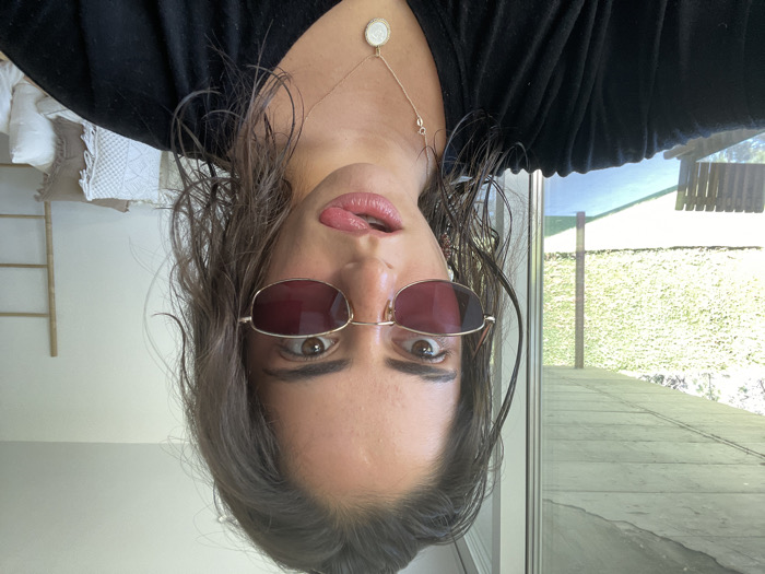 A forensic examination of the image reveals a medium close-up, eye-level perspective of a female subject, presumably indoors in Vilar, Spain. The subject has dark, wet or damp hair and is wearing a black V-neck top. She is equipped with small, gold-framed, rectangular sunglasses featuring dark red lenses. Visible accessories include a gold chain necklace with a circular, possibly coin-shaped, pendant and a small white stud earring in the visible right ear. Her facial expression is characterized by a slightly extended tongue, angled leftward from her mouth. The background on the left, viewed through a large window, displays an outdoor environment comprising a vibrant green, vegetated area, a concrete overhang or ceiling structure, a dark vertical support pillar, and a portion of a wooden slatted outdoor bench. The background on the right, within the indoor space, consists of a plain white wall, a light-colored wooden ladder-like structure leaning against the wall, and a section of a sofa or bed with light-colored, textured pillows. The subject is positioned facing the camera.