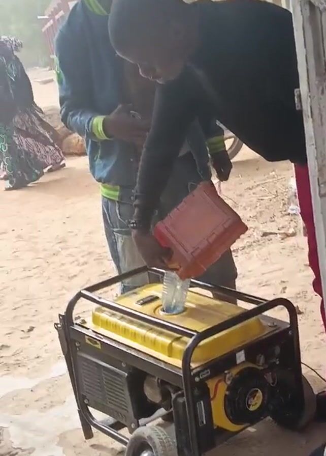 A person is pouring liquid from a red container into the gas tank of a yellow generator. Another person in a blue jacket is standing nearby, looking at a phone. The generator is on wheels and is sitting on a dirt surface. The camera then pans away and focuses on a brown surface with a bracelet with pink and white beads and a white cloth.
