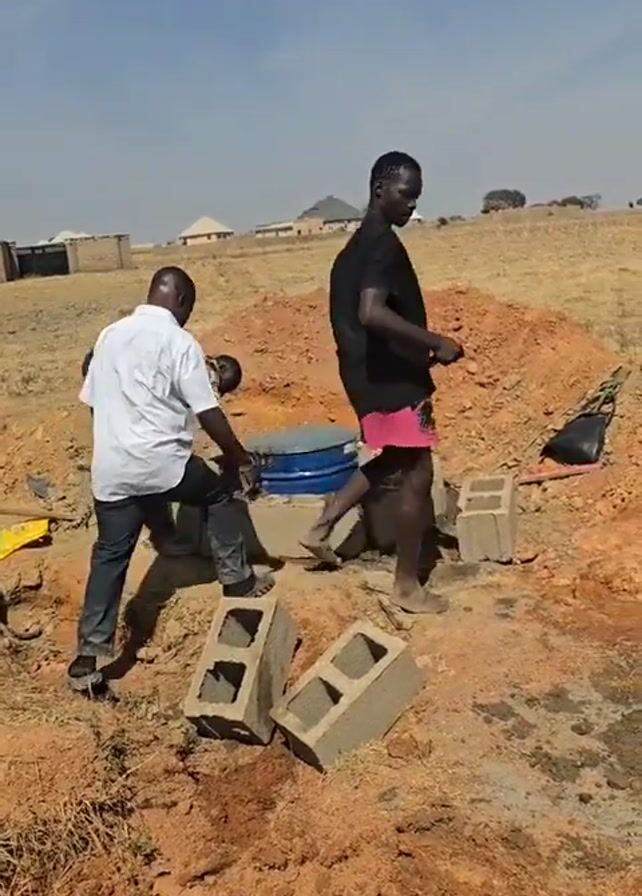 three men working on what appears to be a well or small cistern on a plot of land. The landscape is dry with reddish-brown soil. In the background, houses can be seen. One man, wearing pink shorts and a black shirt, is using a tool to work on the cistern. Another man, wearing a white shirt and dark pants, is standing near the cistern observing the work. A third man, wearing a patterned shirt and dark pants, is bent over working on the structure. There are several concrete blocks scattered on the ground. One of the men raises his hand to gesture towards the background. The sky is blue with light cloud cover.