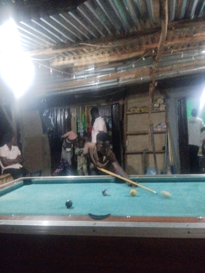 A dimly lit indoor scene features a man playing pool on a green table. He leans over, cue in hand, focusing on the balls. A black ball sits near the left edge of the table. Behind him, onlookers gather, including adults and children. The room's ceiling has a corrugated metal roof. Shelves are visible along the back wall, and a person stands in a doorway in the background.