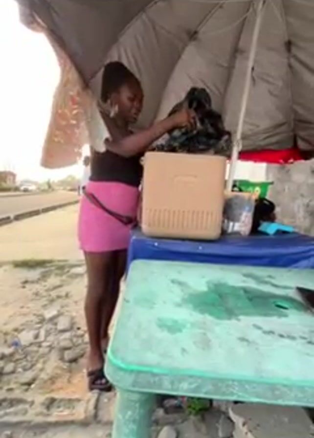 A young Black woman stands behind a light green table under a large grey umbrella. She is wearing a black tank top and a short pink skirt, and sandals. Her hair is pulled up. She reaches into a beige cooler on the table. There is a black trash bag, a blue plastic object, and a cell phone on the table next to the cooler. The table is set up on a dirt and concrete curb on the side of a road. There is a busy road in the background. The woman is talking to someone off-camera. She pulls a white container out of the cooler.