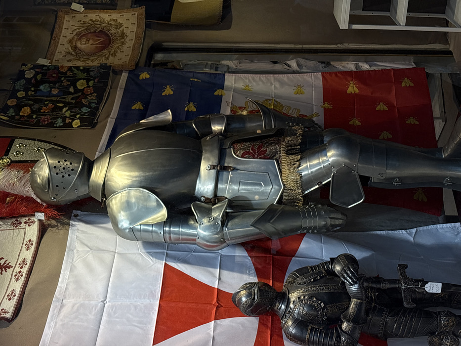 This image captures the interior of a shop in Strasbourg, France, displaying historical-themed merchandise. The central focus is a full-size, polished silver-colored suit of medieval plate armor standing upright and facing to the right, slightly angled away from the viewer. The armor features a closed visored helmet with ventilation holes, articulated shoulder, elbow, knee, and leg plates, and appears to wear a patterned red and gold fabric surcoat or tunic visible beneath the chest and waist plates, adorned with a gold fringed trim. To the left of the main armor, a smaller, dark-colored, intricately decorated suit of armor stands, holding a sword. A white price tag attached to this sword reads "Replica Armor 995€." The background consists of various flags and tapestries hanging against a dark wall. Immediately behind the smaller armor and extending behind the large armor on the left, there is a white flag featuring a prominent red cross, similar to a St. George's or Templar cross. To the right, behind the large armor, a blue flag with numerous yellow fleur-de-lis motifs is visible. Further right and partially obscured, a red flag patterned with yellow Napoleonic bees hangs. Above these flags, on the upper right, two tapestries are displayed: one dark-colored with a colorful floral design and an image of the Eiffel Tower, and another lighter-colored tapestry featuring a central crest with a stylized 'N' and eagles, indicative of the Napoleonic Empire. A partial view of a light-colored tapestry with a red motif is also visible in the upper left. On the far right, a segment of a white, multi-tiered shelving unit is present. The overall lighting suggests an indoor commercial setting.