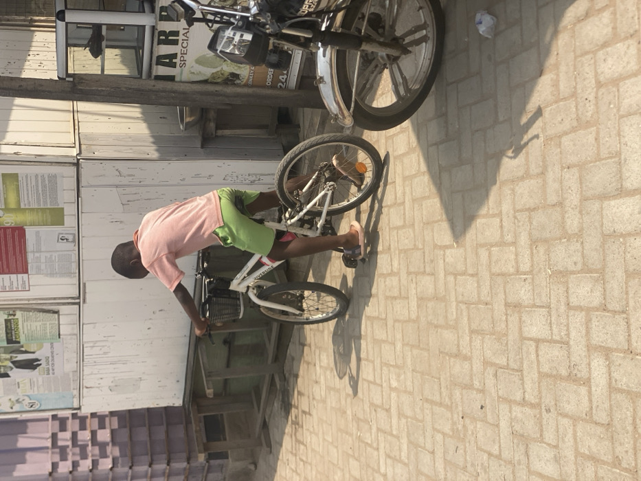 The image captures an outdoor scene in Accra, Ghana, under bright daylight. A young individual, seen from behind, is on a white bicycle equipped with a black front basket. The person wears a light pink short-sleeved t-shirt and light green shorts. Their left foot, wearing a light pink flip-flop, is on a pedal, while the bare right foot is near the ground beside the bicycle's rear wheel. The bicycle's frame displays "Riverside." The ground beneath is paved with light-colored interlocking bricks arranged in a herringbone pattern. In the background, a structure composed of distressed, white-painted wooden panels serves as a wall, adorned with several posters; one prominent poster depicts a male figure and includes the text "BABA SADIQ." To the left of the scene, stacked light-colored blocks are visible. To the right, the front wheel and chrome fender of a black motorcycle are partially visible. Adjacent to the motorcycle, a commercial display includes a small glass-topped case, a wooden shelf with a metal bowl, and a sign below reading "SHARP SPECIAL," featuring images of green produce. Strong sunlight casts distinct shadows across the paved ground, indicating a high sun angle.