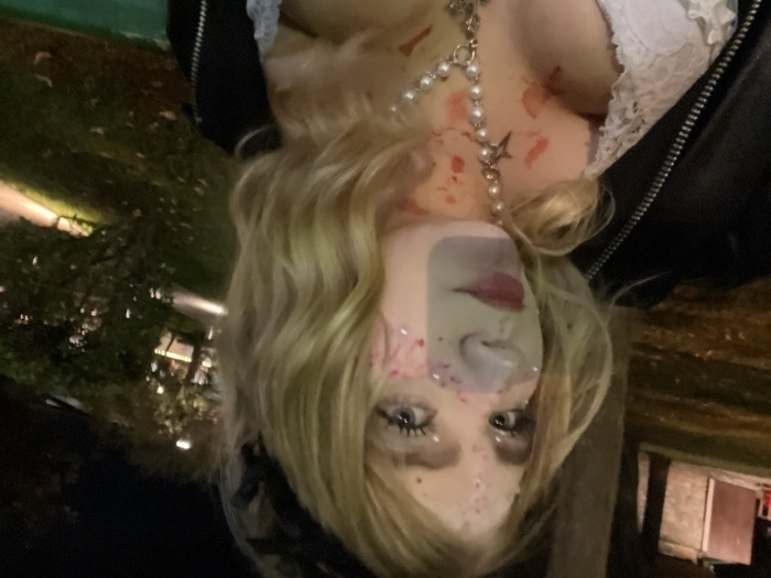 A blonde female is depicted in a close-up, chest-up self-portrait taken at night in Budva, Montenegro. Her face is partially obscured by a semi-transparent rectangular overlay, though her eyes and mouth are visible. She wears heavy eye makeup with glitter accents near her eyes and temples. White splotches cover areas of her forehead and cheeks, accompanied by red, blood-like spatters on her face, neck, and upper chest. A black headpiece is visible on her head. She wears a pearl necklace featuring a silver-colored, star-shaped pendant. Her attire includes a white lace garment visible at the décolletage, overlaid with a black leather jacket featuring a prominent silver zipper on the left side. The background on the left is dark, showing a tree trunk and a structure with a reddish-brown wall. The background on the right displays a landscaped garden area illuminated by warm artificial lighting, revealing trees, shrubs, and scattered leaves on the ground.