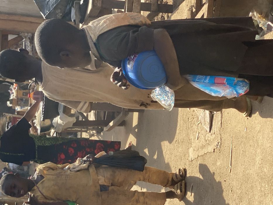 In the city of Kafanchan B, Nigeria, an outdoor scene depicts an informal street market or food vendor area under bright sunlight