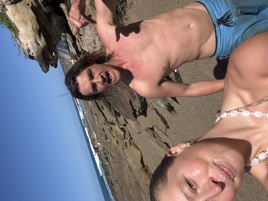 The image displays two individuals on a rocky beach at Coalcliff, Australia, under a clear blue sky