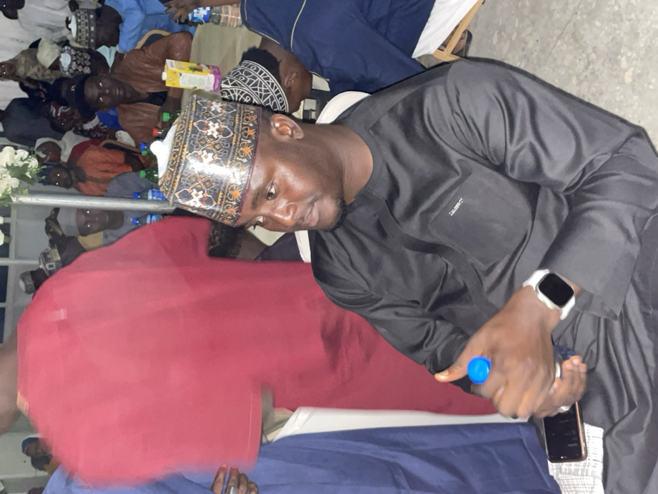 A man in a dark grey traditional garment and patterned hat looks downward, holding a water bottle and phone. He wears a white smartwatch. The setting appears to be an indoor gathering with other people in the background, some wearing similar hats. There are water bottles and other items scattered around. A red and blue cloth are partially visible in the foreground.