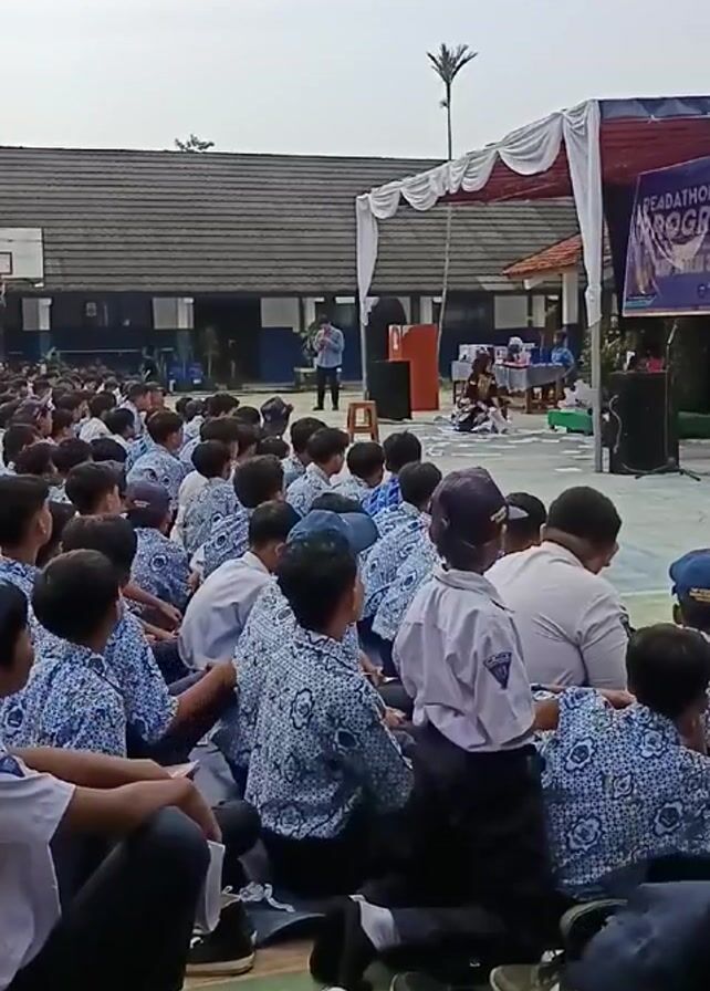 A medium shot shows a crowd of children sitting on the ground and listening to a man speaking on a stage. The children are wearing school uniforms of blue and white. Many of them are sitting with their knees drawn up, while others have their legs extended. The stage is decorated with white and red fabric. There is a banner on the right side of the stage. A man stands at the lectern, speaking to the crowd. Behind the crowd is a school building with a basketball court. The sky is overcast. There are many shoes scattered in the foreground, apparently left by the students.
