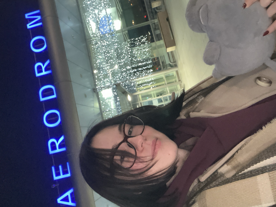A young woman with dark hair and glasses poses for a selfie at night. The blue, neon-lit word "AERODROM" is displayed vertically to her left. Behind her is a glass building decorated with a multitude of small, white lights. She wears a maroon shirt and a plaid coat, and holds a gray plush toy in her right hand. Her expression is neutral with a hint of a smile.