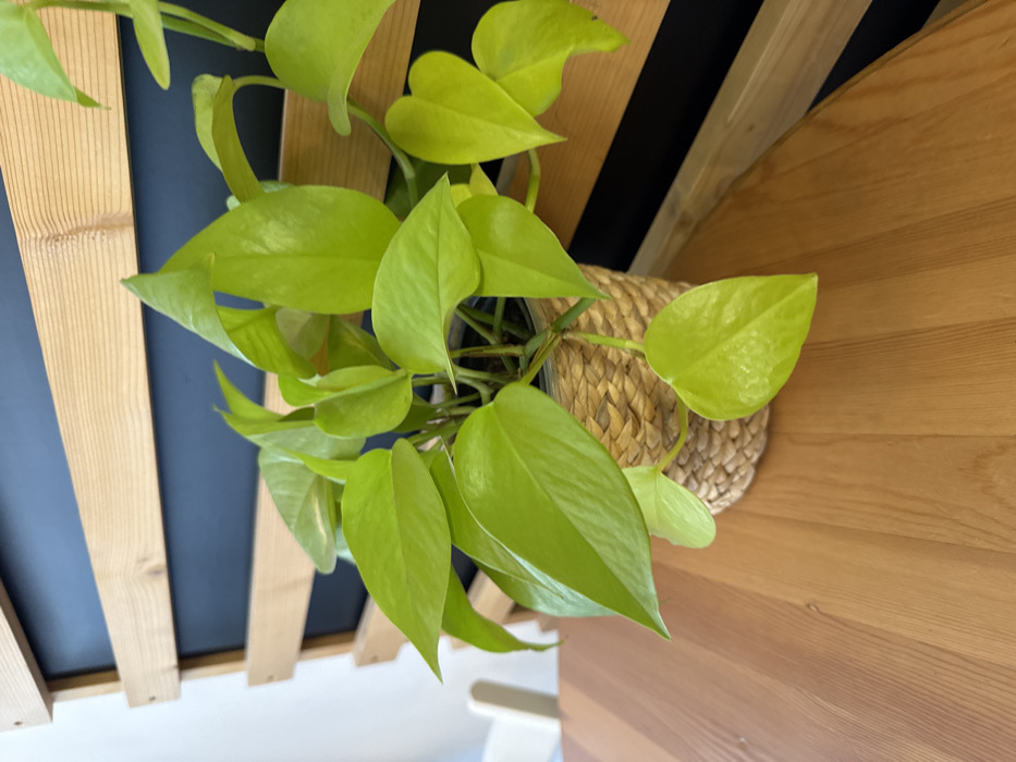 - "A potted Neon Pothos plant, characterized by its bright chartreuse-green, heart-shaped leaves, is positioned on a light-brown wooden table surface" by FM-tFDjG2, licensed under CC BY 4.0
