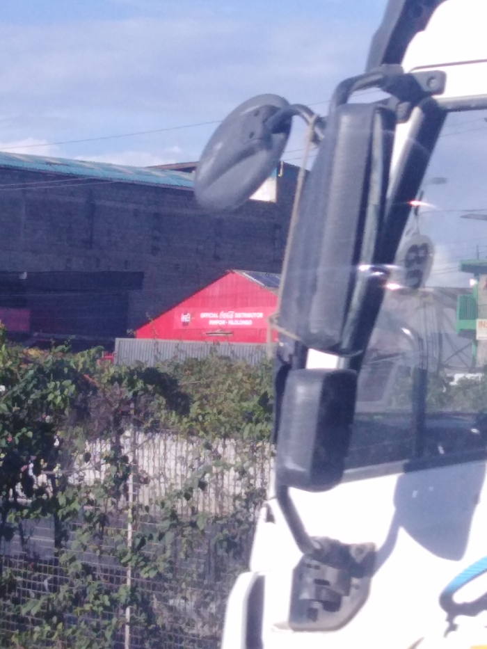 A daytime shot depicts a vehicle's side mirror obscuring parts of a cityscape. Behind the mirror, lush foliage conceals a white fence. Further back, a red building, labeled "Official Coca-Cola Distributor," stands prominently near a gray industrial structure under a bright sky. The mirror reflects the exterior environment, adding depth to the image and blending the foreground with the backdrop.