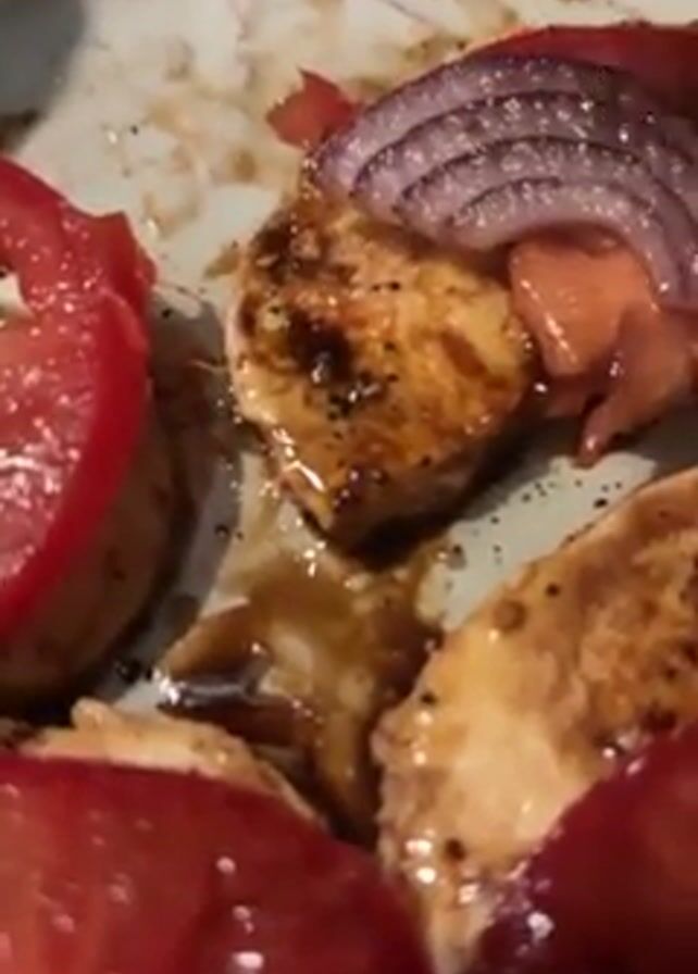 close-up of a plate of food with a fork digging in. The plate has sliced, cooked chicken pieces, with slices of red tomato and red onion. There appears to be some kind of sauce drizzled over the chicken. A fork moves to lift a piece of chicken with red onion and tomato, then the plate is lifted.