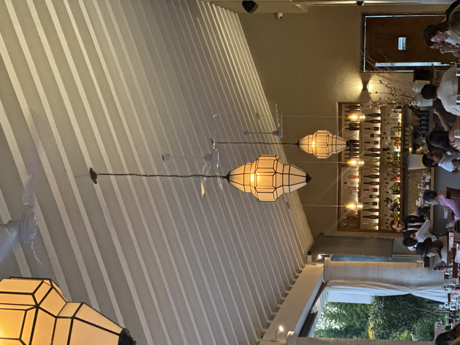 interior of a restaurant with a distinctive slatted ceiling. Hanging from the ceiling are several ornate, lantern-style light fixtures. A bar area is visible in the background, stocked with various bottles. Seated patrons can be seen enjoying their meals, creating a bustling atmosphere. Outside, there is a glimpse of lush greenery through a draped opening.