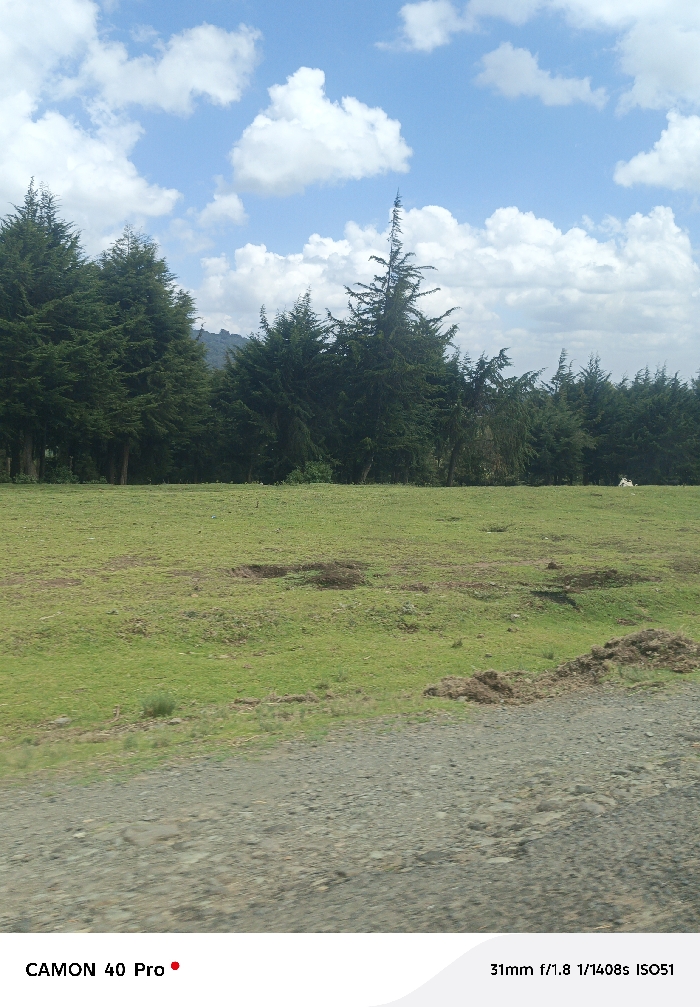 The image displays an outdoor landscape under a bright blue sky punctuated by scattered white cumulus clouds. The foreground consists of a grey-brown gravel path or unpaved road. Immediately beyond the path, a broad expanse of green, uneven grassland occupies the midground, featuring several darker brown patches of exposed earth. A dense treeline of tall, dark green coniferous trees, likely cypress, forms the background, extending horizontally across the frame. A single light-colored animal, possibly a cow, is partially visible standing near the treeline on the right side. A faint, dark mountain peak is discernible behind the trees on the far left. No individuals or prominent human-made structures are visible. The scene is located in Kitengela ward, Kenya.
